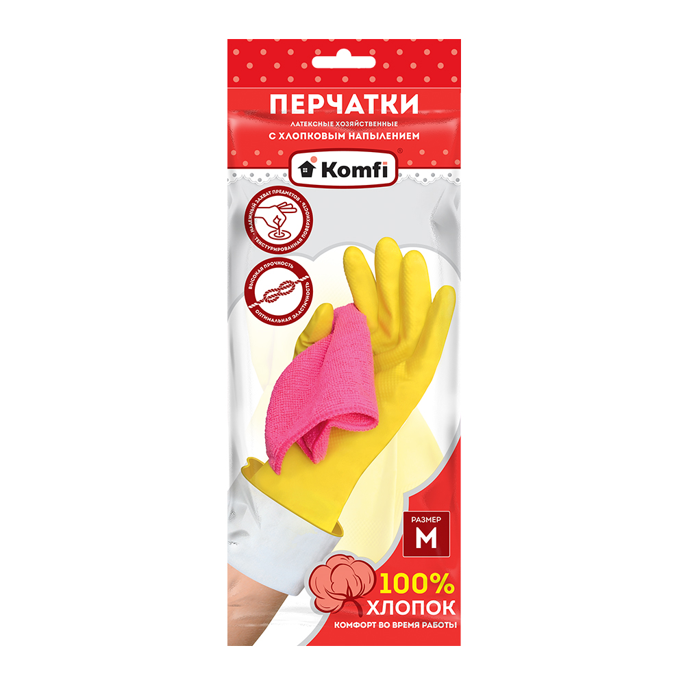 Перчатки хозяйственные латексные Komfi "Для деликатной уборки" с х/б напылением M желтые DGL017L (12пар/уп; 240пар/кор)